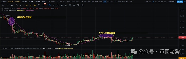 APE:首先从日线级别来看,APE目前价格在1.68刀附近。目前日线级别APE站稳5 10MA均线上方,日线级别呈现出多头趋势,不过从图片上来看,APE在0.99附近历史低点上涨以来,近期反弹的最高点在1.89附近,第二次冲击高点在1.75附近,价格依然没有站稳。说明APE日线级别在1.75—1.89附近抛压还是比较大的,但是考虑到目前走势,APE已经持续多日连阳,如果主流市场不出现大幅度调整,短期APE可能会放量上涨,如果价格突破了1.89的近期高点,近几周时间内可能会试探3刀附近的抛压区域。按照现在的价格,如果涨到了3刀附近,那么APE将会有70%左右的收益。