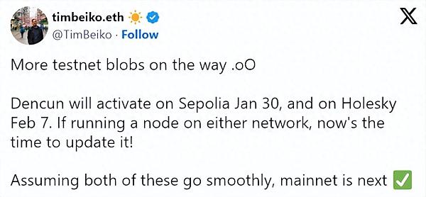 Dencun升级的部署过程包括在各个测试网络上的激活,今年1月底在Goerli和Sepolia测试网的激活之后,2月7号也成功完成了在Holesky 测试网进行测试的最后阶段。