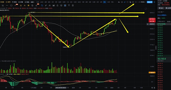 周线上看,大饼这波反弹属于69000下跌到15400这一波下跌后的反弹走势,这个反弹也能算是下跌后的正常反弹,行情如果不破69000,上方还是会有一波回调机会 ,并且回调的力度也比较深,现在市场上的消息面对于币圈来说也算是一片大好,即将迎来的美联储降息,以及大饼减半,还有现货ETF的资金在不断地涌入,这些都是大饼持续反弹的因素,这些消息面都是属于长期的利好,并不是短期快涨快跌,这波反弹如果上方压力位置被有效突破,那后市很有可能就是破69000了,周线级别的压力位置在58000附近,该位置比较重要,大饼上方是还有6000个点的上涨空间,目前周线收线没有出现下跌信号,交易上我们就保持回调做多为主的思路,如果到达58000附近,周线再收长上影线的情况下,再可以考虑去做空,目前距离最近的支撑位在48700位置,在48700-58000区间去做高空低多,直到破位,交易思路,回调做多为主,周线出现做空信号再考虑空单的长线布局,自行把握进场机会;短线交易,控制风险,盈亏自理;