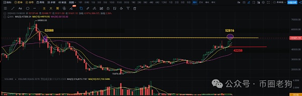 从大饼周线来看,上一周大饼最高价格来到了52816附近,价格已经突破了上一轮牛市下跌反弹后的高点52088。这也说明这轮牛市的初期已经接近尾声,牛市即将步入中期节奏。不过从价格上来看,上一周大饼价格收线时站稳了52088上方,但是价格没有继续上涨,说明52088附近的抛压还是有的,不过目前来看抛压不是很大。短期大饼大概率会经过短暂的调整过后继续向年内新高进发。