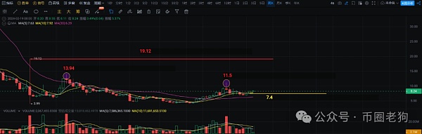 从图中可以看到AXS经过2022年周线级别的天地针行情过后,价格一直在这区间宽幅震荡。经过一年多时间的洗盘,价格又从近两年低点附近开始反弹。目前周线级别经过近两个月调整过后,价格再次站稳了周线级别5 10MA上方,从指标上来看MACD金叉还没有形成,因为目前AXS的价格在8.26附近,没有超过上一周最高价格8.34。如果这一周价格站稳在8.34上方,那么AXS大概率会继续向短期高点进发。11.5——13.94是近一年周线级别的抛压区域,每次价格达到这个位置附近都会出现量能较高的抛压,如果在之后的反弹中13.94这个位置能放量突破。那么AXS将会向19.12继续进发,也就是之前周线级别天地针的最高点,如果19.12放量突破并且站稳,后面的价格就不太好估计了,可能会到几十刀或者是上百刀。