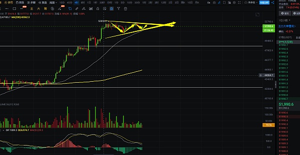 4小时线上看,大饼高位持续震荡,走出小型的三角震荡区间,目前还未打破,后市将会持续走震荡,大饼前面只要不破52859位置,大饼就有回调机会,52400附近大饼是有个日线级别压力,行情也是上涨到该位置后没有去继续上行,这里就很有机会去走出一波回调,大饼可以在压力附近52400去轻仓做空单的布局,行情突破52859,空单放弃,行情将继续拉高,不给到破位,那就可以持有到50000-49000,自行把握进场机会;短线交易,控制风险,盈亏自理;