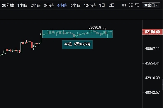 从大饼来看,虽然目前处于高位震荡,但这并不是一个顶,反而是一个蓄力的过程:如图所示,目前的区间就维持在51000到上方的52500区间,昨日虽然有刷高以后的快速回撤,但回撤并未破前面的低,形成了短期的双底,而尾盘的上行也使得日线级别并未形成看跌的形态,也就说明这个回撤只是高位的一个探底的回撤,而不是见顶的回撤。