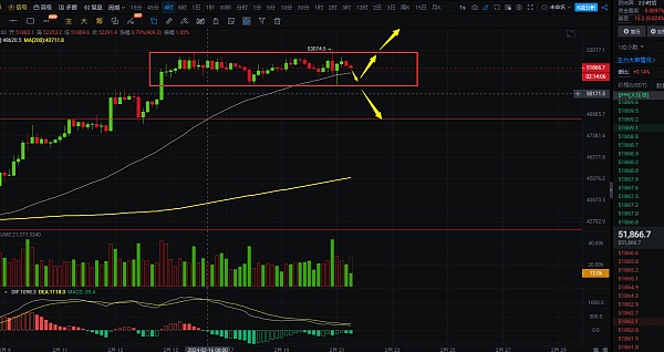 4小时线上看,大饼延续区间震荡,下跌反弹都没有有效突破箱体,都只是试探后再去继续走震荡,日内大饼小幅下跌的机会应该会有,预计到达点位在51100附近,到达后看昨日低点破位,跌破50733位置,行情将会到49000附近,反之上方突破53074,也算打破箱体震荡,也将持续拉高,往54000附近去靠了,日内交易上就围绕箱体做高空低多,下方关注点位50733,上方关注点位53074,不管是哪一方破位,就及时止损,日内个人认为下破机会更大,交易上自行把握好进场机会;短线交易,控制风险,盈亏自理;