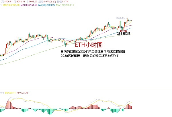 2月21日以太坊(ETH)合约技术面分析:今日方面,大周期日线级别昨日报收小阳线,K线形态上连阳上涨,价格在均线上方,附图指标金叉运行,而要注意的是当前价格有些偏离均线了,回归均线支撑位置在2930区域附近,所以按照目前的走势来说我们还是要预防出现较大回撤修正的走势风险;短周期小时图昨日美盘冲高后承压回撤,今日早间延续上涨,高点3035区域,起涨点2885区域,当前价格高位横盘整理,附图指标金叉缩量,那么日内还是要先看回撤修正走势的,因此今日ETH短线合约交易策略:现价3010区域直接空,止损3036区域,目标看2950-2930区域,回撤2930区域多,止损2905区域,目标看3000区域