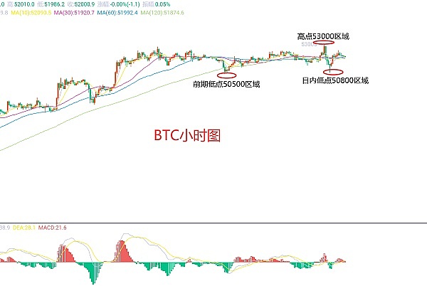 2月21日比特币(BTC)合约技术面分析:进入方面,大周期日线级别昨日报收小阳线,K线形态上连阳上涨,价格在均线上方,附图指标金叉缩量运行,虽说油缩量迹象,但价格回撤当前是没有力度的,走势是伴随冲高后出现的回落,而回落价格也没有向下破位,这样来说空还是先放弃,主要以回撤多为主;短周期小时图昨日美盘时间价格冲高后承压回撤,高点53000区域附近,回撤低点50800区域附近,没有破位前期50500区域低点,当前K线形态连阴,附图指标油死叉迹象,所以日内是有回撤修正的需求的,因此今日BTC短线合约交易策略:现价52100区域直接空,止损52500区域,目标看51300-51200区域,回撤51200区域多,止损50900区域,目标看52000区域;