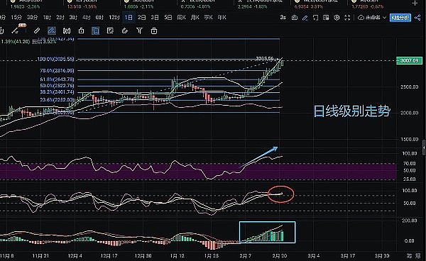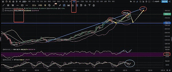 当前4小时走势价格K线同样强势踩着布林带上轨延续多头方向,短线支撑基本在布林带中轨2890附近。破位则可能去向本轮多头第一强支撑2760,当然一旦去向2760便是空头开启点宣告这轮牛市结束点了