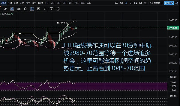 ETH短线操作还可以在30分钟中轨线2980-70范围等待一个进场追多机会,这里可能拿到利润空间的趋势更大。止盈看到3045-70范围