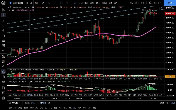 大饼昨日冲高回落低位再次试探50600附近支撑,但没能跌破随后反弹,最高触及51940一线受阻,恭喜跟上低多思路的朋友获利1000点,目前币价在51600附近运行,四小时级别盘面来看行情整体处于50000-53000区间震荡,上不冲高下不破低,目前关注区间中枢51400若实体跌破有机会试探底部支撑,不破则会继续反弹,日线级别多头缩量关注ma14支撑情况,走势来看近期突破的概率不大,预计会持续区间震荡,给到49000-48500可以分批买入,日内思路建议高空低多对待,上方压制52000-52500,下方支撑51000-50500