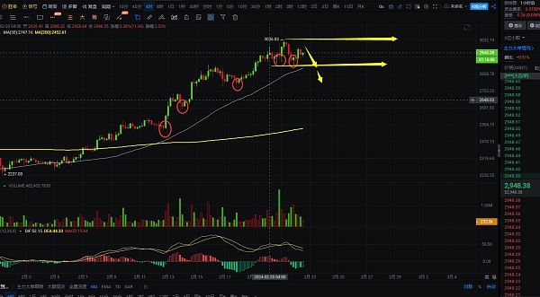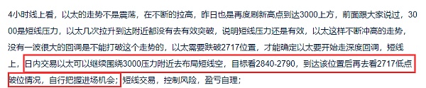 4小时线上看,以太的这波走势上看,前面低点是在不断抬高的,反弹后的下跌也没有破前面的回调低点,昨人的行情大饼的跌破了前面短线低点,虽然跌幅不大,以及后面收下影线上去,但这能说明上方目前没有前面那么猛了,开始出现初期的下跌迹象,加上4小时级别上在3000附近有一定的压力,整体情况来看,以太有机会给到一波回调机会,日内关注3036高点的破位,行情只要不破3036低点,后市再下跌跌破昨日以太低点2867位置,那基本上这个下跌就问题不大了,日内交易上,昨日空单有的可以继续持有,没有的可以在3000附近做新的布局,目标依旧是先看2840-2790,到达后再去看破位,自行把握进场机会;短线交易,控制风险,盈亏自理;