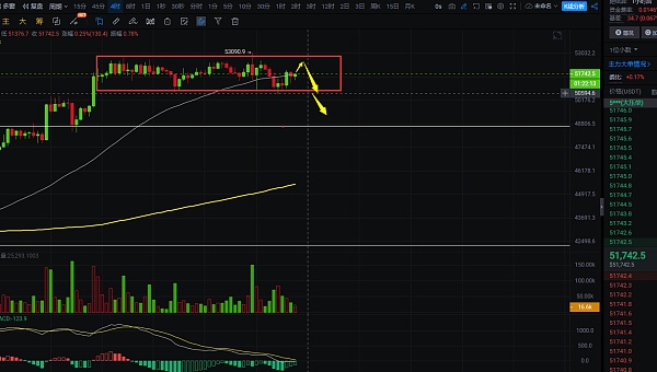 4小时线上看,大饼依旧是持续高位震荡,昨日小破一下震荡区间低点但是没有延续下跌,收针反弹后再度回到箱体震荡区间,虽然我个人更看好下跌破位,但在行情还没有走出实质性的下跌之前,做好心里的预期就好了,大饼交易上依旧是做高空低多,上方关注高点53090位置破位,短线反弹需关注52300附近,到达后根据情况做空单的布局,就震荡思路去做,破位止损就可以,区间依旧是53090-52600箱体,自行把握进场机会;短线交易,控制风险,盈亏自理;