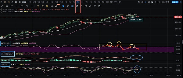 图中;4小时走势趋势,冲高回落就比较明显了,较高点3075大概回调了73点左右。K线运行在4小时布林带中上轨道间。RSI趋势轨迹逐步从多头区间70值震荡下行至中轴线50值附近,局部时段存在击穿50中轴风险,相应的价格K线也可能会跌穿中轨支撑2955附近回踩至下方2890