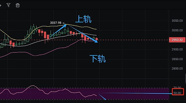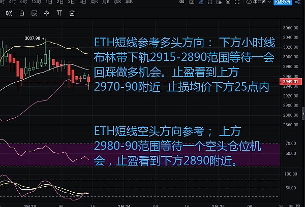 ETH短线参考多头方向: 下方小时线布林带下轨2915-2890范围等待一会回踩做多机会。止盈看到上方2970-90附近 止损均价下方25点内