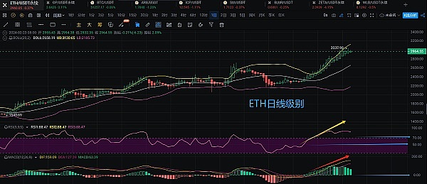 ETH日线级别走势,K线形态仍然踩着布林带日线上轨多头排列,高点至3035附近,当前价位在2960附近,虽有回落但整体上升趋势线并未走坏。。技术指标方面RSI上穿中轴50值到70值上方后价格持续拉高,当前RSI趋势线头有所钝化向下勾头庄,走势可能会在高位3000附近震荡回落,MACD方面快慢线O轴下方金叉后,O轴上方成交量也呈现连续放量趋势。当前成交量有所缩量,快慢线高位有开口收缩迹象。盘中出现暂时性见顶信号。但多头强势抬头走势并未终结,空单布局还需谨慎考虑不要过早安排提前量!