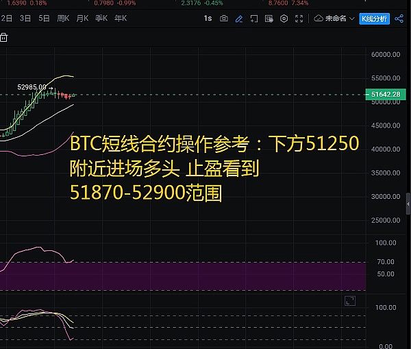 BTC短线合约操作参考:下方51250附近进场多头 止盈看到51870-52900范围