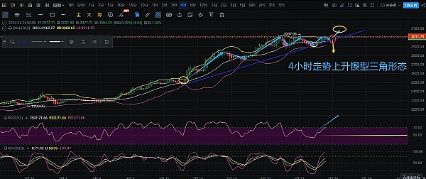 4小时级别走势中,K线走势分布处在一个上升锲型三角中,盘中不跌破蓝色上升趋势线,基本还会延续冲高走势。技术指标方面RSI趋势线目前在中轴线50值附近大角度上行破位70值多头区间,拉升走势较为强烈当前价格指数3030附近。KDJ指标J线值低位上穿K,D周期线后上穿开口角度持续放大中。对于反弹走势都起到了很强的正面支撑。