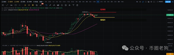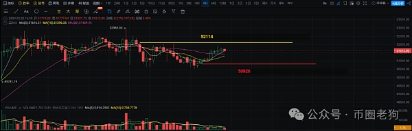 从四小时级别来看,四小时级别经过几天时间的震荡,目前价格延续四小时级别5 10MA均线上行,从图中可以看出以50826为低点的四小时级别K线,收线价格站稳了均线上方,之后行情开始反弹,所以短期50826可以看做是四小时级别的支撑位。上方大饼从52985高点下跌后开始反弹,之后以52114为高点的四小时级别直接收了一根跌穿四小时级别5 10MA均线的K线,之后行情多次反弹都没有突破52114的高点,所以52114为短期四小时级别的压力位,如果行情持续反弹,只有价格突破了52114上方并且站稳,大饼才有可能继续新高进发,反之大饼没有站稳52114上方并且之后四小时级别K线收线价格跌穿了均线。那么短期大饼大概率会继续试探50826附近支撑是否有效。