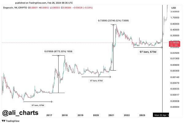 马丁内斯的图表说明了 狗狗币随时间的价格变动,突出显示了狗狗币价值显着飙升之前的重要积累时期。 历史数据显示,狗狗币过去每 679 天的价格积累(类似于 2017 年和 2020 年代初的情况)都会导致大幅指数增长,分别增长 8.773% 和 23.740%。