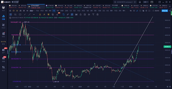 牛回速归,2024龙年行情可谓是喜人,行情不断的走出新高,大饼6.9w的最高点也是触手可及,上一个交易日以太坊依然是走出白盘回踩,晚盘反弹的走势,更是走出了5.7w和3290的高点。