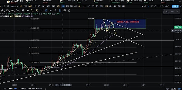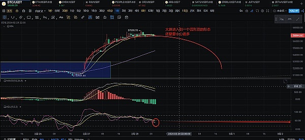 BTC从下图可以看出目前走出了弧形顶的趋势,所以当前还是要小心追多,一旦后面走出完整形态,那么现在追多就可以能追在了弧顶。