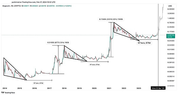 当前图表反映了牛市中DOGE价格所遵循的模式。事实上,这里DOGE也有周期性的出现。与比特币减半图表类似但有所不同。2013 年 12 月,狗狗币在周线图上形成下降楔形。接下来是长达 679 天的盘整期和令人惊讶的 8,773% 牛市。