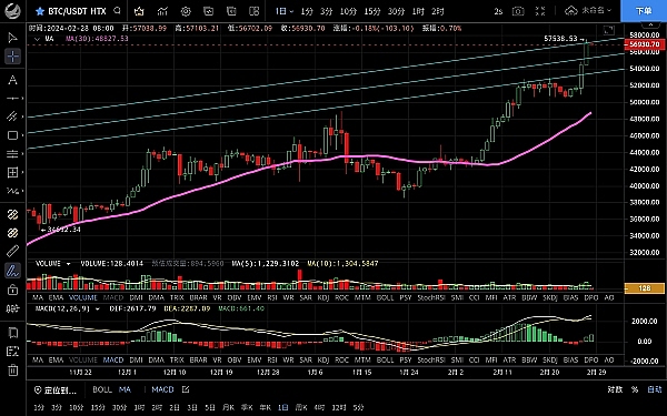 大饼昨日低位回踩至55530一线支撑反弹,行情一路上行,突破前高至57540附近受阻回落,恭喜跟上昨日思路的朋友多单获利1500点,目前币价在56900附近运行,四小时级别虽突破新高但未能延续,行情回踩修复ma7均线,macd多头缩量双线金叉状态,短期走势回踩需求若跌破ma7则有高位震荡修复ma14的迹象,日线级别来看k线收大阳但量能未跟,若日线收十字预计行情会有回落的风险,整体走势仍是多头回踩后会继续上行,思路依旧是低多为主高空为辅,上方压制57300-58300,下方支撑56000-55500