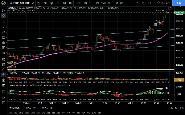 以太坊走势和大饼一致,整体呈震荡上行突破新高,最高触及3285一线受阻回落,恭喜跟上昨日思路的朋友多单获利80点,目前币价在3238附近运行,四小时级别整体呈高位震荡走势,虽突破新高但没有延续,macd多头逐步缩量双线聚拢有死叉迹象,短期走势上行概率不大,关注回踩力度有试探ma14支撑的风险,日线级别k线收上影多头延续不大,白盘预计会走震荡,目前行情超买短期注意风险,关注回踩力度整体依旧是以低多为主高空为辅,上方压制3280-3350,下方支撑3200-3160