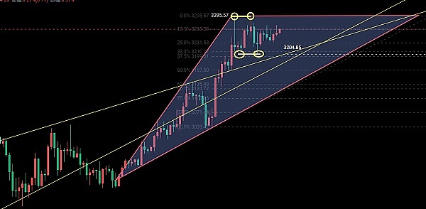 一小时给出的是上行三角形态,同时三角顶部给到双针探顶,短暂探顶于3295附近,同时两次的探顶后的回踩,同样形成双针筑底,筑底于3205一线。上升趋势线和下行趋势线汇合,形成强力的拐点位置3205,这个位置可以说决定后面的走势,处于斐波那契回撤线0.35处。失守,回踩空间进一步扩大,守住,则继续吹起冲锋的号角