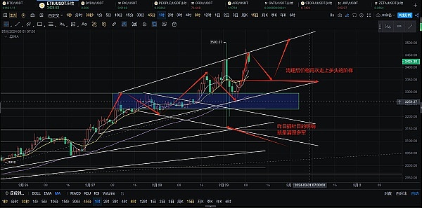 一波洗盘之后小时线还是走出了5连阳,再次触及到3500这个位置的压力,短期来看价格有回踩的需求,下方支撑在3370-3350.毕竟以太现在距离历史新高还比较远,按照大饼的涨幅 以太仍然有补涨的需求。所以以太今日白盘的思路是等待一个回踩去做一个低吸。区间参考下方3350-3370