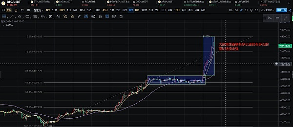 大饼秉性着横有多长竖就有多长的理论继续走强,现在K线组合已经没有参考的意义,全是市场情绪使然。大饼距离历史新高69000 还差5000点,这个月涨幅2万多点,今天是月末最后一天,明天换月线大概率还是延续一个惯性上涨,破新高也只是一瞬间的事,但破新高前会不会像以太一样来一个更深的天地针洗盘一次,就让我们拭目以待了。