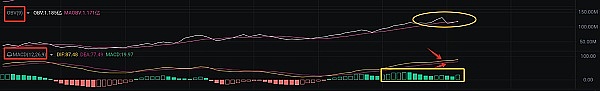 能量潮OBV指标当前快线下穿周期移动线后彼此粘连,那么未来时间节点多,空双方局部时段并未有强弱之分,走势多为震荡态势。也暗示着多,空仓位的操作风险系数变大。MACD方面快线和周期移动线平行走势,拉出很长的轨迹。小周期还将延续震荡走势。