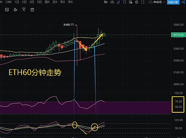 ETH60分钟走势,随着KDJ指标的交替金叉,死叉,价格K线也在布林带中上轨间完成的波段走势,下方小时线中轨3340附近,可能会在短线多头支撑3407破位后回调到达!