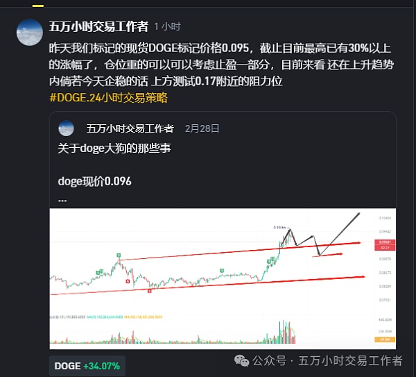 昨天我们推荐的doge,截止目前最高已有30%以上的涨幅了,仓位重的可以可以考虑止盈一部分,目前来看 还在上升趋势内倘若今天企稳的话 上方测试0.17附近的阻力位