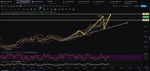 ETH参考策略:3431继续做多,止盈3550,止损3400