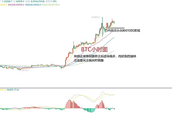 2月29日比特币(BTC)合约技术面分析:今日方面,短周期日线级别昨日报收大阳线,K线形态连阳上涨,价格在均线上方,附图指标金叉放量运行,价格回撤均线支撑位置在57650区域附近;走势规律还是再强调,回撤没有力度,上涨强势,欧盘的强弱是关键,短线顺势去做即可;短周期小时图昨日美盘延续上涨破高,凌晨出现快速下跌反抽走势,低点位置58650区域,高点64000区域,之间价差还是比较大,当前出现小幅回撤,但按照规律来说,回撤看不到力度,但回撤风险也要预防,这样的情况下就是小止损来继续博延续上涨,因此进入BTC短线合约交易策略:回撤62000区域多,止损61650区域,目标看62800-63000区域;