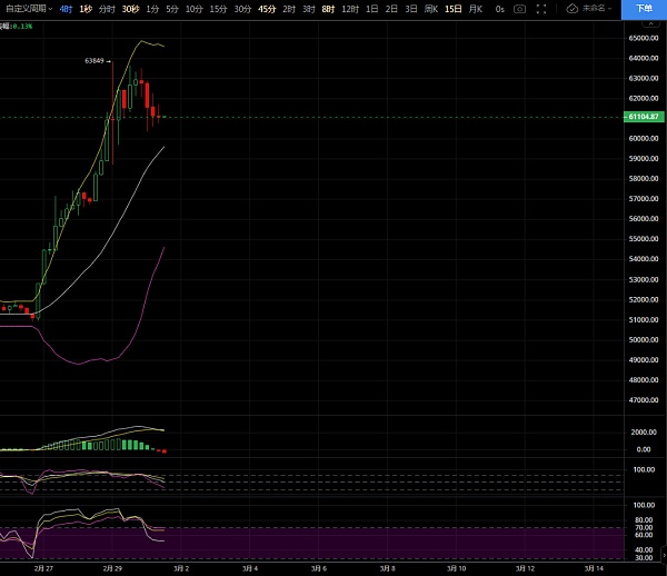 趋势面前任何技术面皆是空谈!大饼行情昨日自晚间冲高63600后,开始逐步承压回落,连阴配合下直逼60000关口,整体走出近3000点空间,目前行情在底部企稳后开始在61000附近震荡修复,任何単边节奏都将伴随着回撤来进行,不可能会一味的张,这就是币圈的节奏,也告诉大家,牛市多暴跌,注意好自己的仓位。BTC在2月份涨超50%,周四触及64000距离历史高点69000仅差7.8%,废话不多了,咱们看看今日盘面走势情况。
