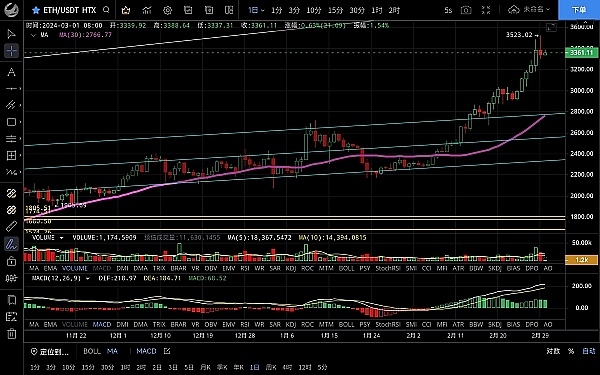 以太坊跌至3180后再次反弹,昨日白盘一路上行最高触及3523一线受阻,恭喜跟上思路的朋友多单获利80点,目前币价在3370附近运行,四小时级别行情冲高回落跌破ma14支撑,macd多头转空双线死叉向下,行情虽有反弹但力度不大,若能突破站稳ma14则有继续上行的可能,反之会继续试探ma30,短期关注回踩力度,日线级别来看行情回踩打破连阳走势,近期一路走高短期出现回调也是正常,正好修复强势拉升的盘面,思路建议关注回踩力度低多为主高空为辅,上方压制3380-3460,下方支撑3300-3250