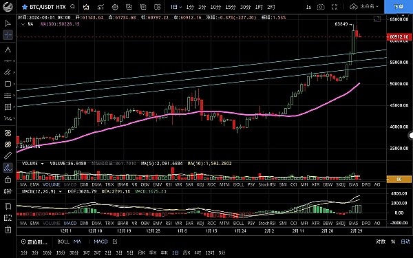大饼昨日二次上攻未破前高,白盘高位震荡后选择下行,低位跌至60360附近支撑反弹,恭喜跟上低多思路的朋友获利近2000点,目前币价在61140附近运行,四小时级别走势如思路一致回踩ma14后暂时止跌,macd多头逐步缩量双线粘合有高位死叉迹象,行情反弹力度不大上方有ma7均线压制,短期走势有回踩需求,日线级别短期上涨受阻,关注6w支撑情况,有回踩修复ma7的需求,若收线不破6w的前提下继续维持多头思路,后市有冲击前高6w9的可能,上方压制62000-63000,下方支撑60500-60000
