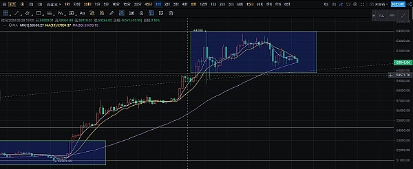 从小时图可以看出大饼进入到一个很高位置的横盘6万到6万4区间,一个健康的牛市都会伴随适当的回踩,现在回踩已经逼近了MA50这个长周期均线,可以看到前面的价格走势都是在这个均线上方,现在价格来到均线处表明回踩需求还是比较大。