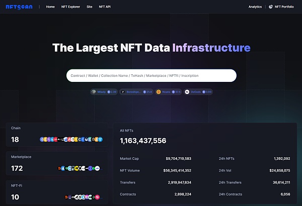 NFTScan 目前拥有全网最大最全的 NFT Collection 库,已支持 Ethereum、Solana、BNBChain、Bitcoin、TON、Polygon、zkSync、Aptos、Linea、Base、Avalanche、Arbitrum、OP Mainnet、Starknet、Scroll、Mantle、Viction、Fantom、Moonbeam、PlatON、Cronos、Gnosis 22 条区块链的 NFT 全量数据,所涵盖的 NFT 数据全、种类丰富,提供一整套的接口来获得 ERC721 和 ERC1155 资产以及交易、项目、市场统计等信息,现在支持 60 多个针对 EVM 兼容链的公共接口,以及针对 Solana、Aptos、Bitcoin、TON 的一批相同模型的接口,很大程度上满足了开发者索引多种类型的 NFT 数据的需求。
