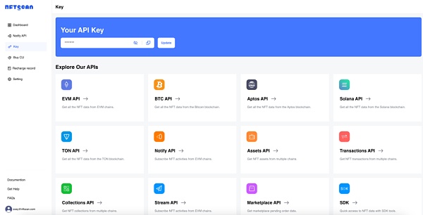 注册成功后就可以开始使用 API 服务了。进入 Dashboard 界面后,开发人员可以查看自己 API 使用情况的统计数据,帮助记录历史使用数据。不仅如此,NFTScan 为每位注册开发者提供 1M CU 的 API 调用服务,用于请求所有的 NFT API 接口,并且 CU 永不过期,用完为止!