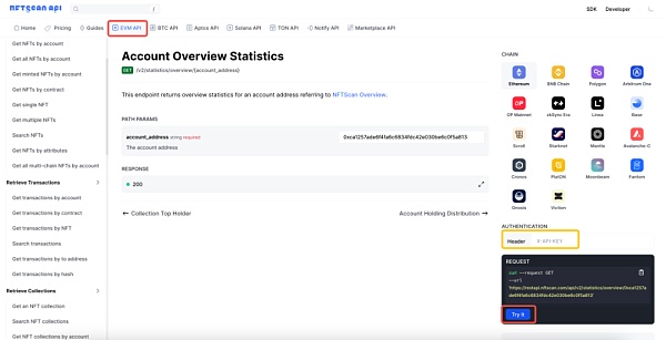 在 API 文档中找到您需要的 API 接口和参数后,编写 API 请求代码并使用 NFTScan API 文档中提供的请求参数和响应数据格式来构建请求。