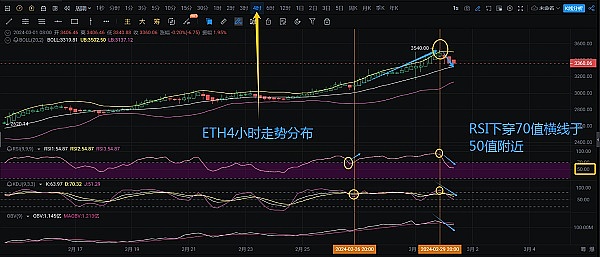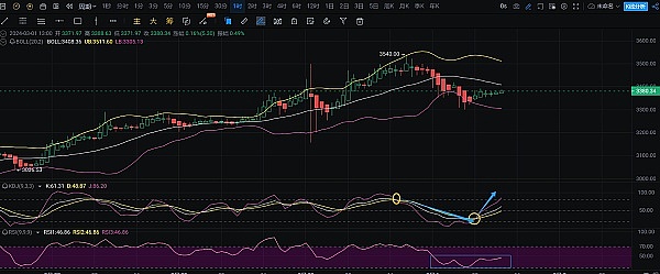 上图是ETH60分钟的走势情况,价格在布林带下轨道止跌反弹,K线形态多头缩量上行。KDJ指标方面 J线值上穿K,D周期线,上穿角度持续张开上行态势。对于价格指数震荡走高有支撑力。RSI趋势线在50中轴下方完成了短暂的震荡整理当前上行贴合50值线。盘中继续有冲高3410附近势能,但短期3410一线阻力还需要底部支撑反复确认后方能有效突破!