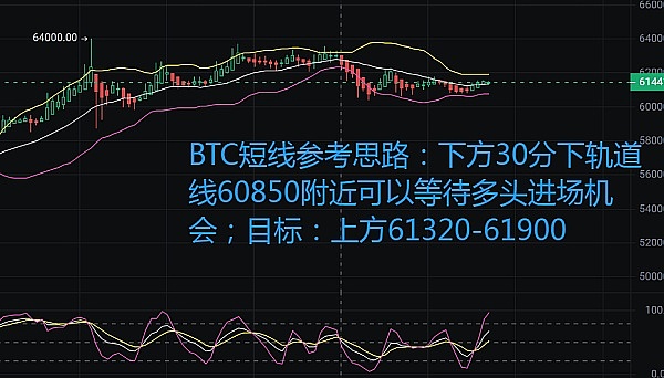 BTC短线参考思路:下方30分下轨道线60850附近可以等待多头进场机会;目标:上方61320-61900