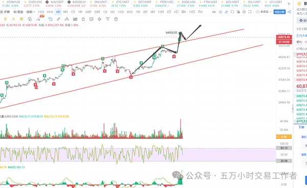 行情在64000美元之后开始回调目前交易价格在60821美元,四小时级别看各项指标还是有回调空间,只要不跌破58500美元的支撑位这个上升通道的趋势就没有破坏