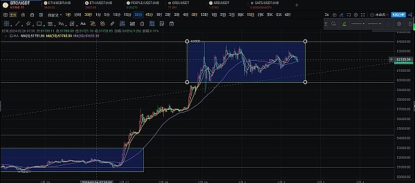 大饼来到64000以后距离历史新高就一步之遥,相对于别的币种来讲大饼的走势可以说是遥遥领先,但是越进阶历史遇到的阻力也就越大,再次创造历史必然需要一个蓄力的过程。大饼目前也是来到了一个高位的调整阶段从下图可以看到价格在箱体内不断的调整,但是可以注意到每次回踩的低点都在不断的走高,支撑位也在升高,这也是一个走强的信号。