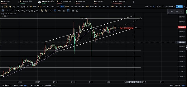 以太经过连续的拉升之后,目前也是到了一个修正的阶段,现在看短期回调还是有需求的,在这个区间内还是会冷静一段时间。昨日回踩3375后再次反弹到3450这个位置,说明下方3420-3380的支撑还是很强,近期还是可以依靠这个支撑位继续上看,那么今日主要思路还是低多也是没有什么问题。