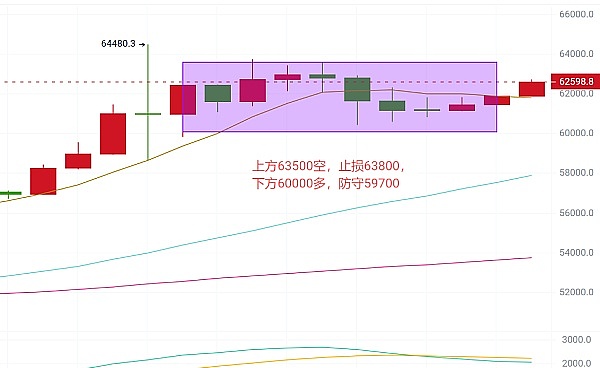 比特币月线收出一根实体大阳线,2月整体上涨幅度约43%,创下自2017年以来单月最大涨幅,一路直逼2021年的高点,本周最高在64000上方承压断崖式回撤了5000余点,随后行情在60000下方得到承接插针反弹,币价迅速被拉回了61000上方,说明当前在60000附近有大量的承接盘,市场看涨情绪较浓,由于本周行情的快速拉升导致目前各指标均有滞后,技术面参考意义不大,行情需要时间来补齐前期上涨带来的缺口,短线下方给到60000可多单进场,防守300个点,上方63500给到可空,止损63800即可。