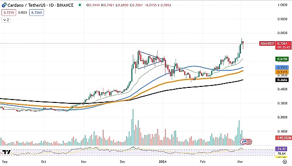 仔细观察ADA价格图表就会发现,虽然该货币一直在经历上涨轨迹,但成交量的减少可能意味着这次反弹可能没有坚实的基础。如果市场不能恢复交易量以加强上涨趋势,近期 ADA 价格的飙升可能面临风险。 卡尔达诺的价格正在测试关键阻力位。如果交易量继续下跌,ADA有可能失去支撑并进入严重回调。如果再次以低交易量测试先前可靠的支撑位,则可能无法维持,从而导致持有该资产的人可能遭受巨大损失。