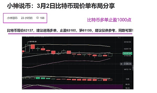 小神:恭喜 行情如期暴涨 比特币现价在62137布局的多单 完美拿下1000点